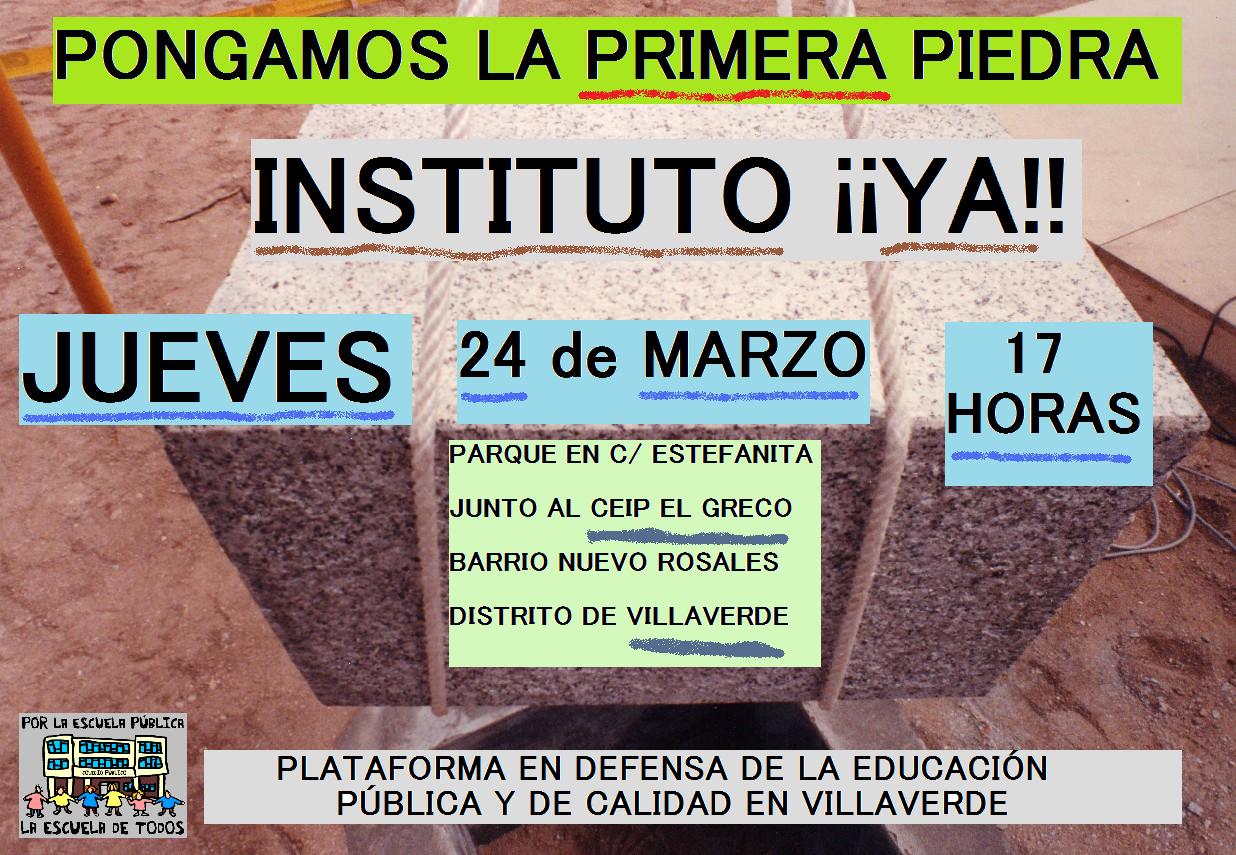 El próximo 24 de marzo, la Plataforma en defensa de la educación pública y de calidad en Villaverde organizará un acto reivindicativo y simbólico que consitirá en poner la primera piedra del IES que le corresponte al barrio de Los Rosales-Butarque. El evento tendrá lugar a las 17 horas en el parque de la calle Estefanita, junto al CEIP El Greco.Nota informativa del alumnado de la escuela de adultos de Villaverde